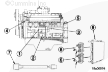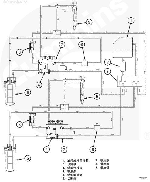 輸油泵 (4) 從客戶燃油箱或常用油箱 (1) 中抽出燃油。燃油通過康明斯或客戶預濾器 (2) 和燃油連接塊 (3) 循環(huán)。然后燃油流入輸油泵 (4),在輸油泵中增壓,并通過發(fā)動機上的燃油濾清器 (5) 循環(huán)。燃油流過燃油切斷閥 (6),然后流入噴油泵 (7),噴油泵使燃油達到噴油壓力并在適當?shù)臅r間將燃油輸送到每個噴油器 (9)。