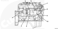 1. 機(jī)油排放 2. 渦輪增壓器冷卻液回流 3. 渦輪增壓器機(jī)油回流 4. 排氣出口接頭 5. 渦輪增壓器機(jī)油供應(yīng) 6. 渦輪增壓器冷卻液供應(yīng) 7. 節(jié)溫器殼體 8. 機(jī)油冷卻器 9. 冷卻液進(jìn)口 10. 機(jī)油濾清器。
