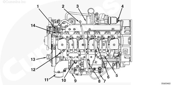 下圖顯示主要的發(fā)動(dòng)機(jī)外部部件、濾清器以及其它維修與維護(hù)保養(yǎng)點(diǎn)的位置。 注: 該插圖顯示一臺(tái)典型的發(fā)動(dòng)機(jī),僅用作參考。