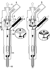 噴油器可以被拆分為一系列功能部件:孔式噴油嘴,液壓伺服系統(tǒng)和電磁閥。燃油來自于高壓油路,經通道流向噴油嘴,同時經節(jié)流孔流向控制腔,控制腔與燃油回路相連,途徑一個受電磁閥控制其開關的泄油孔。泄油孔關閉時,作用于針閥控制活塞的液壓力超過了它在噴油嘴針閥承壓面的力,結果,針閥被迫進入閥座且將高壓通道與燃燒室隔離,密封。
