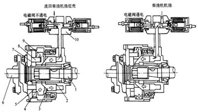 1 – 凸輪軸 2 – 液壓腔 3 – 液壓活塞 4 – 大偏心輪 5 – 小偏心輪 6 – 驅(qū)動軸 7 – 驅(qū)動盤 8 – 滑塊銷 9 – 滑塊 10 – 電磁閥