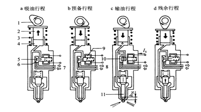 1-凸輪 2-柱塞 3-回位彈簧 4-高壓腔 5-電磁閥針閥 6-電磁閥閥腔 7-進油通道 8-回油通道 9-線圈 10-低壓腔